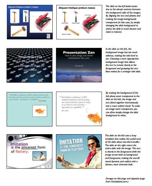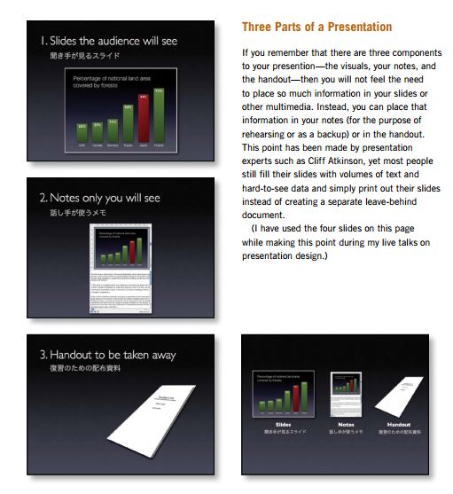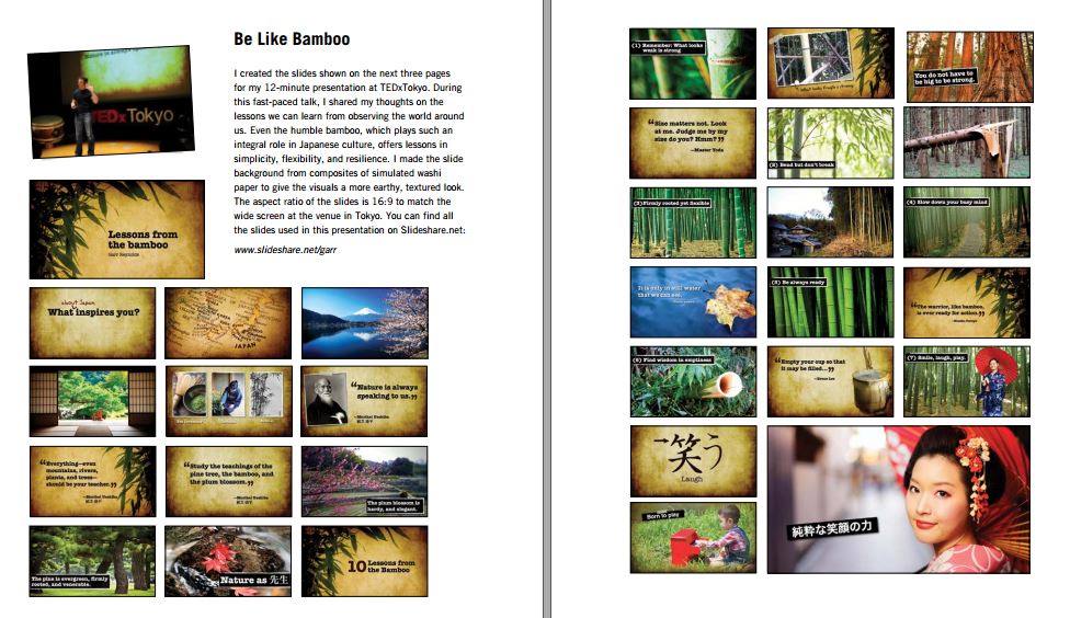 Tác giả đã rất rộng rãi khi tổng hợp khoảng vài chục slide mẫu vào sách để chúng ta học hỏi. Ta có thể cảm nhận chất Thiền, sự đơn giản, khúc chiết, gãy gọn của những slide này, từ đó rút ra kinh nghiệm cho bản thân. Phần cuối cùng của sách hướng dẫn ta phong thái thuyết trình, cách kết nối với khán giả, làm buổi thuyết trình không buồn chán.