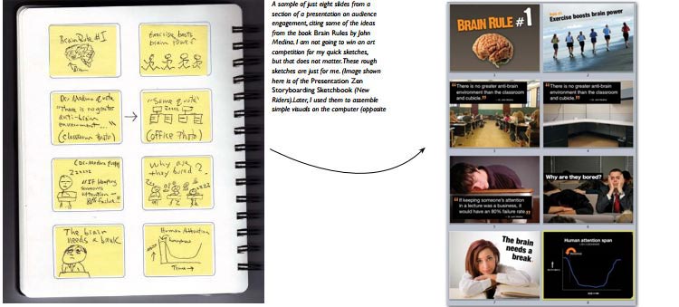 Sách hướng dẫn cách chuẩn bị, sắp xếp nội dung slide, làm cho mọi thứ gắn kết với nhau. Mình áp dụng theo cách này và khá thành công: Vẽ phác nội dung của mỗi slide lên một tấm note nhỏ, dán lên sách hoặc bảng, mỗi slide là một note. Sau đó, ta có thể thay đổi, sửa chữa các note này để có bản thô, dựa vào đó để làm slide hoàn chỉnh.