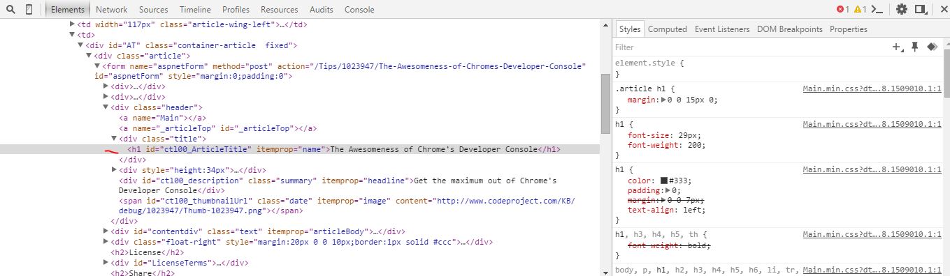 Tab này hiển thị HTML của các element trong trang web. Trước khi có Developer Tools, ta phải sửa CSS, save lại rồi refresh lại page. Ngày nay, ta có thể sửa trực tiếp CSS của 1 element vào khung phía bên phải, xem kết quả ngay lập tức. (Đây là một chức năng khá hay có từ add-on Firebug của Firefox, được các web developer/web designer dành tặng vô số lời khen).