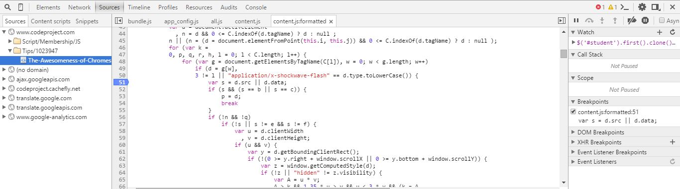 Ở tab này, ta có thể debug xem javascript chạy như thế nào. Với các ứng dụng sử dụng nhiều javascript hoặc dùng các library/framework như jQuery, AngularJS, ta có thể vào tab này, đặt breakpoint và debug như các IDE thông thường.