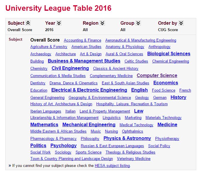 Các bạn có thể vào địa chỉ: http://www.thecompleteuniversityguide.co.uk/league-tables/rankings để xem bảng xếp hạng các trường đại học ở UK (Sao VN không có bảng xếp hạng nào như thế này nhỉ?). Sau đó, chọn ngành mình muốn học bằng cách click vào link có tên ngành.
