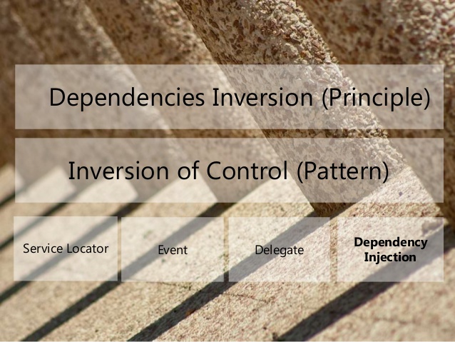 - Inversion of Control: Đây là một design pattern được tạo ra để code có thể tuân thủ nguyên lý Dependency Inversion. Có nhiều cách hiện thực pattern này: ServiceLocator, Event, Delegate, … Dependency Injection là một trong các cách đó.