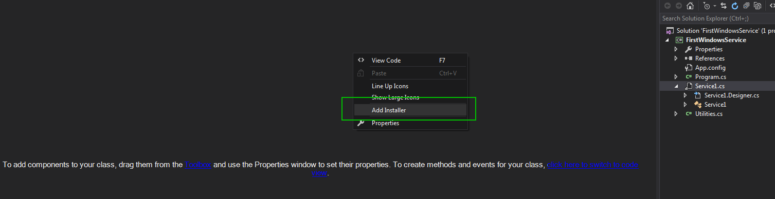 Tới đây thì khá đơn giản để hiểu phải không nào, chúng ta sẽ gọi hàm timer_Tick mỗi 60s để thực hiện 1 business gì đó. Tiếp theo chúng ta trở về UI design của Service1.cs và nhấp chuột phải lên đó để tạo 1 Installer cho WS của mình.