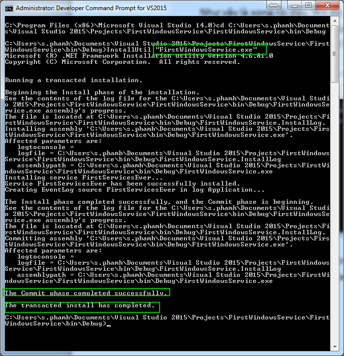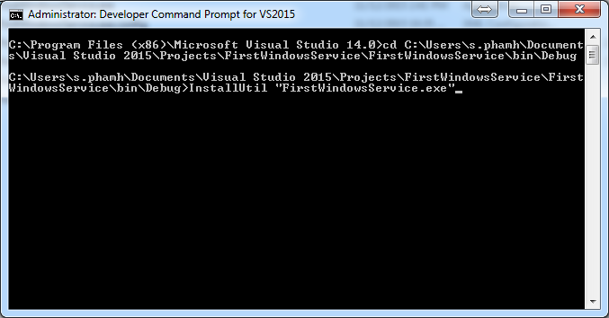 Các bạn mở Command line của Visual Studio 2015 như sau : Start -> All Programs -> Visual Studio 2015 -> Visual Studio Tools -> Developer Command Prompt for VS2015. Tới thư mục debug của Project Windows Service.