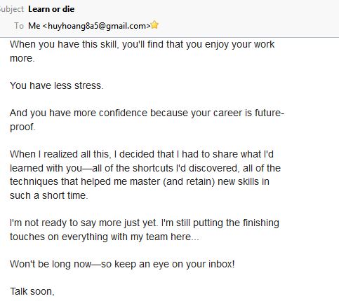 Và rồi, ngay hôm sau, mình nhận được một email cuối cùng. John vừa tung ra khóa học “10 bước để học mọi thứ”. Một đường link trong email dẫn tới trang web quảng cáo cho khóa học này.