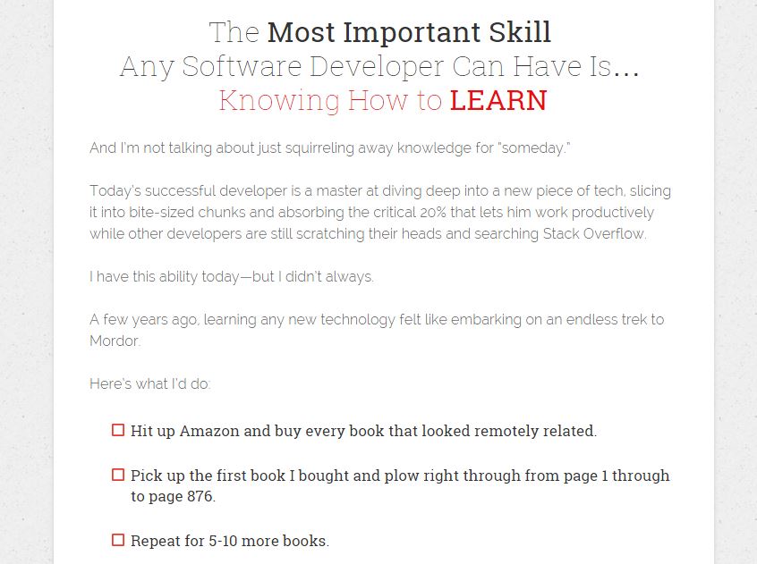 Mail khá vui, kể về những ngày đầu anh vừa đi làm, đang làm tester với mức lương 25$, anh apply qua một cty mới với mức lương 75$. Phỏng vấn khá đơn giản: “Anh biết C++ không”, “À, biết”, thế là được nhận. Điều quan trọng ở đây là “Trước giờ anh chưa bao giờ đụng tới C++ cả”. John đã làm gì? Anh mua một cuốn sách về C++, đọc lúc ăn lúc ngủ, đọc từ đầu tới cuối. Và rồi anh đã master C++ trong 1 tháng. ĐÙA ĐẤY, anh cũng chỉ là người thường như chúng ta thôi, không phải thiên tài đâu. Đọc hết cuốn sách, anh vẫn ngáo ngơ, chẳng thấm được mấy vào đầu. Và rồi John Sonmez rút ra được một chân lý: