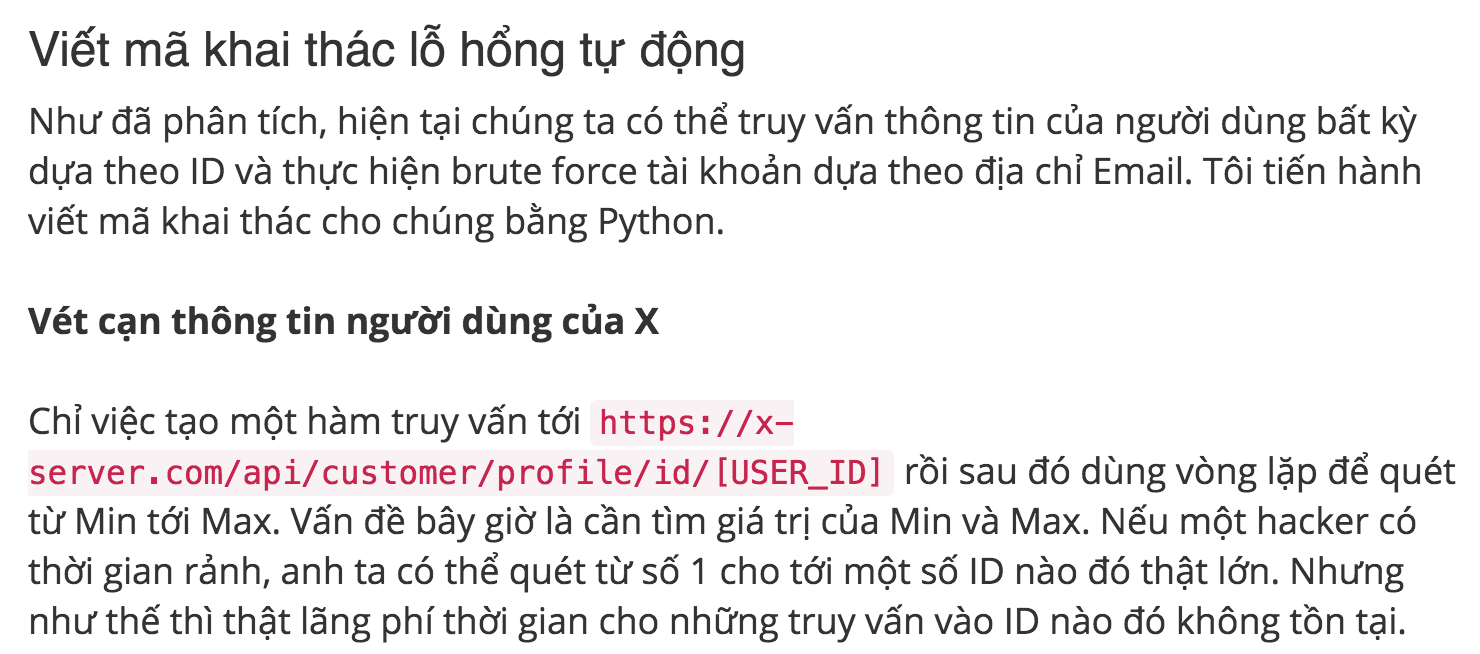 Cách đây khoảng 1-2 tháng, có 1 vụ lùm xùm liên quan tới công ty X (Hình như là CGV), lộ tài khoản của 3 triệu người dùng. Chính lỗ hổng Insecure Direct Object References này đã giúp hacker (ở đây là thánh bảo mật Juno_okyo) lợi dụng và dò ra thông tin của 3 triệu người dùng đó.