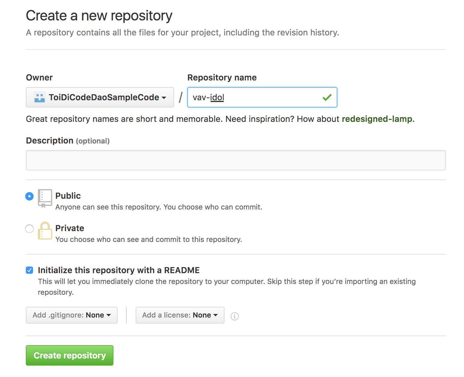 Đặt cho nó một cái tên (gì cũng được), nhớ tick chọn “Initialize with a README” để Github khởi tạo sẵn repository nhé.