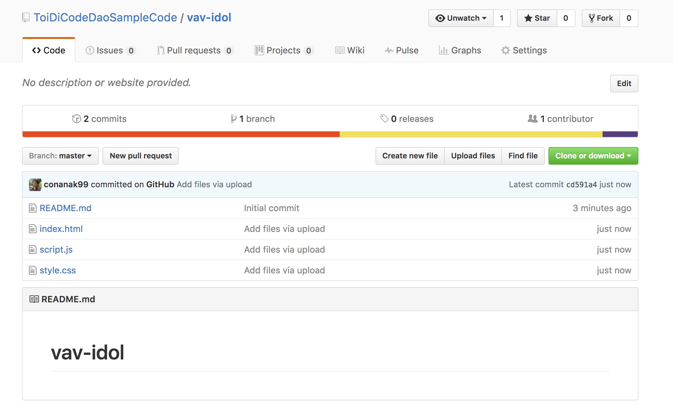Toàn bộ source code cho ứng dụng web chỉ gói gọn trong 3 file. Các bạn vào repo Github của mình để xem nhé: https://github.com/ToiDiCodeDaoSampleCode/vav-idol