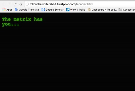 Sau khi ấn vào link Enter The Matrix trong mẫu quảng cáo tuyển dụng, mình được redirect tới một trang web mới như sau: http://followthewhiterabbit.trustpilot.com/fe/index.html
