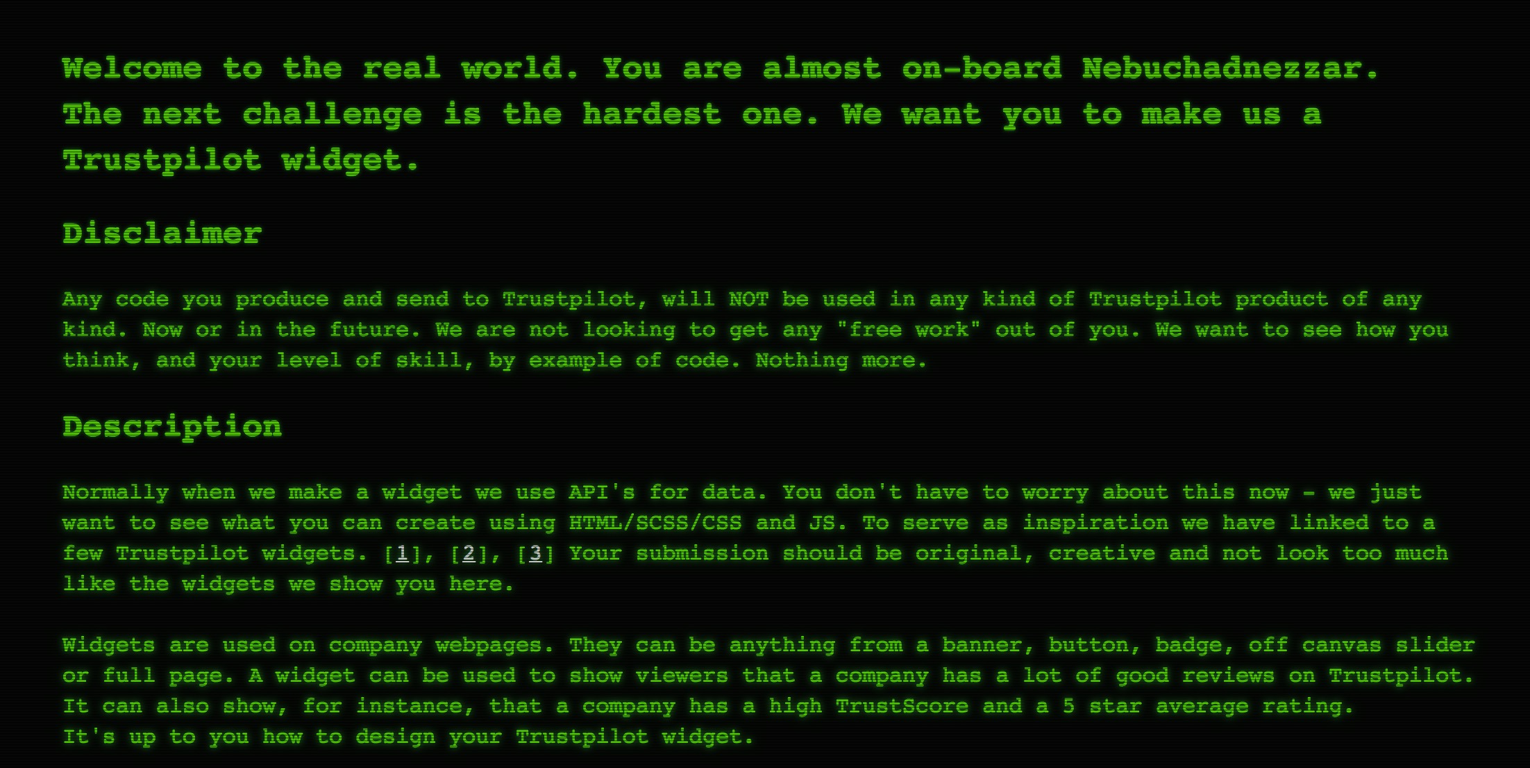 Đây mới là thử thách thật sự của công ty này. Họ yêu cầu ứng viên dùng HTML, CSS, JS để viết một số widget nho nhỏ cho trang web của Trustpilot.