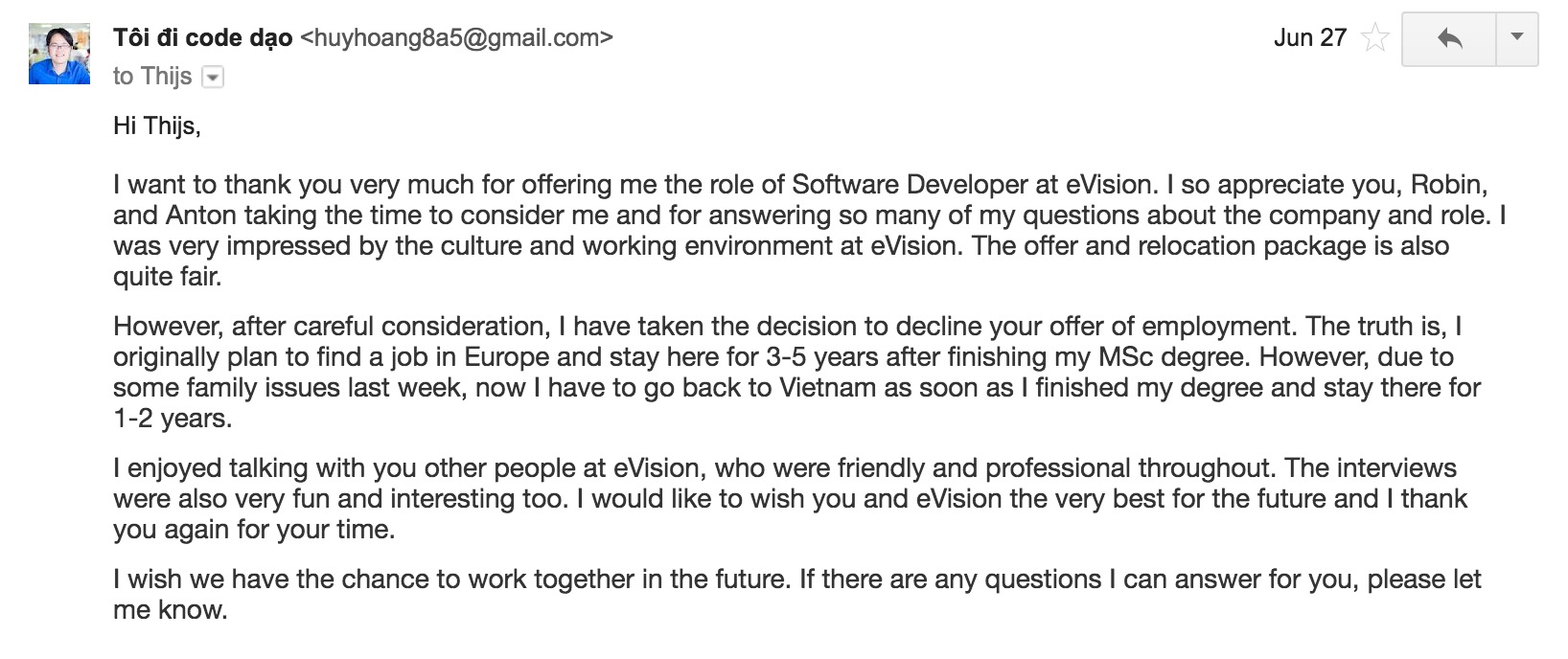 - Cuộc thứ hai là từ eVision, sáng phỏng vấn chiều có kết quả luôn. Anh Thijs báo mình đã đậu phỏng vấn và hẹn sáng hôm sau lên công ty xem offer và kí hợp đồng luôn. Tất nhiên là hôm sau mình cũng lên công ty, xin email có offer để suy nghĩ, sau đó phải vắt óc viết một cái email thật dài để từ chối. Khổ ghê chưa!!