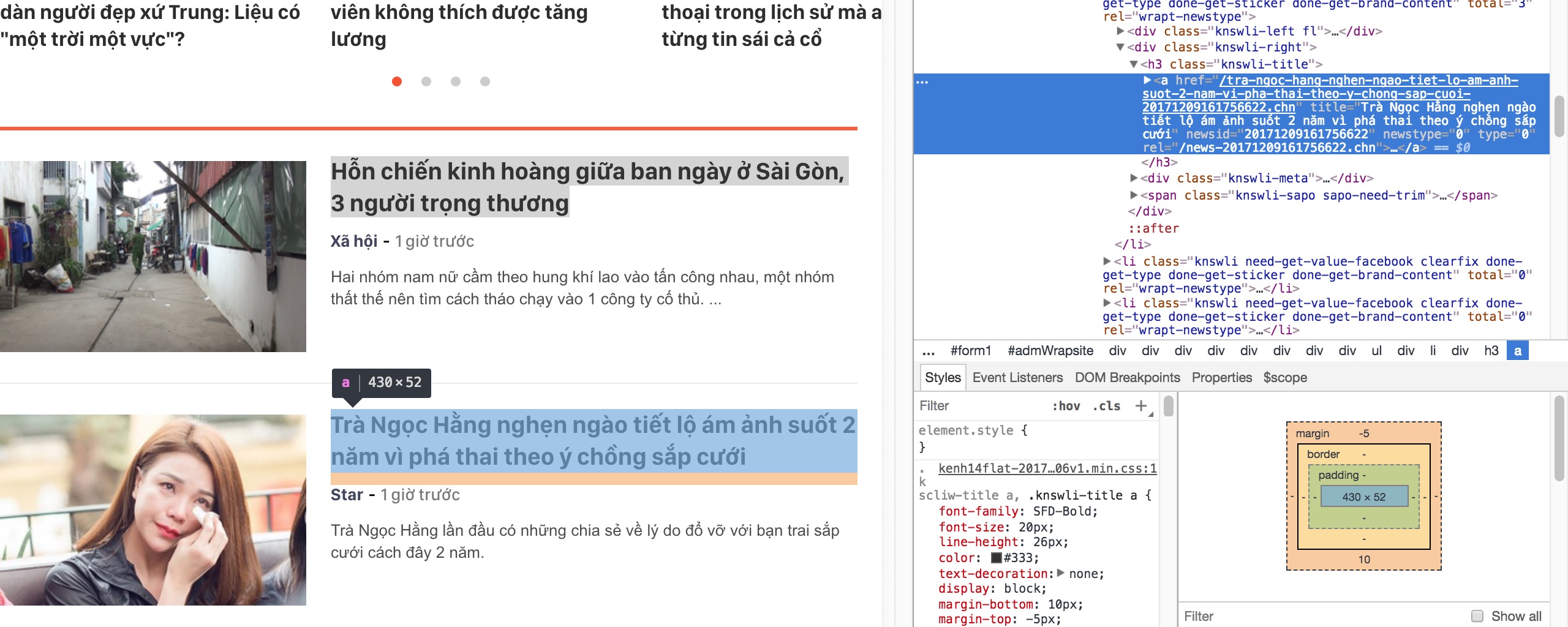 Các bạn có thể thấy, tiêu đề của các bài viết nằm trong element a, con của element h3 có class là knswli-title. URL nằm trong attribute href của element a đó luôn.