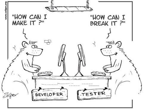 • Công việc của developer là phát triển hệ thống, viết code và bỏ bug vào code; vai trò của tester là tìm lôi đầu những con bug đáng ghét ra cho developer trừng trị.