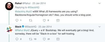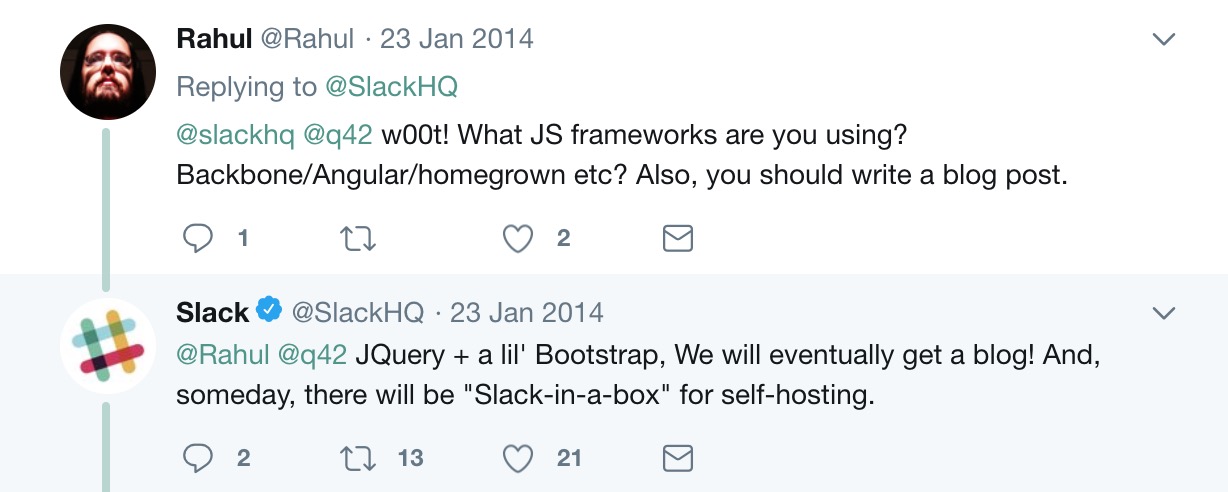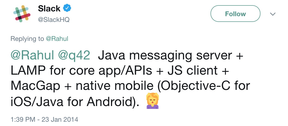 Nói nhỏ các bạn nghe nè, startup Slack – phần mềm chat nhóm nổi tiếng từng có technical stack là LAMP (Linux, Apache, MySQL, PHP). Phía front-end thì dùng jQuery, toàn những công nghệ “già đời” cả!