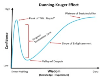 Nhìn biểu đồ bên dưới, các bạn sẽ thấy là càng biết nhiều, sự tự tin-tự kiêu của bạn sẽ giảm đi. Đến một lúc nào đó, khi đã có kinh nghiệm và kiến thức, sự tự tin sẽ dần quay trở lại.