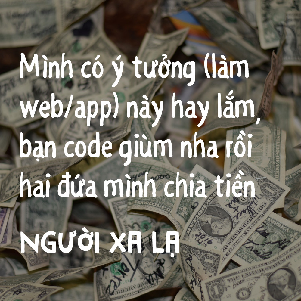Ý tưởng bây giờ rẻ bèo chưa bằng cốc trà sữa nữa. Mình ngồi design, code bục mặt ra, bạn chỉ có mỗi cái ý tưởng, không có plan kiếm tiền, không biết design, không biết marketing sản phẩm mà cũng đòi chia tiền hả?