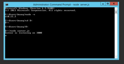 3. Mở cửa sổ command line lên, cd vào ổ D có chứa file vừa tạo và gõ node server.js, bạn đã có một ứng dụng web vô cùng cơ bản rồi.