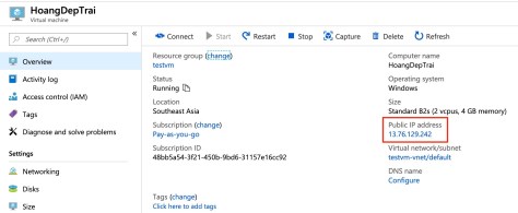 1. Bạn có thể xem trực tiếp bên Azure, hoặc truy cập whatismyip.com từ máy ảo để xem ip của máy ảo đó.
