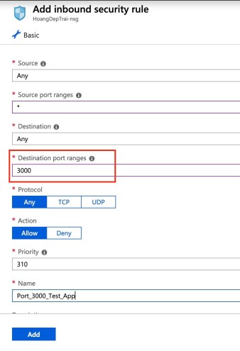 Bạn sẽ thấy ở bài trước, khi tạo VM, ta phải mở port 3389 thì mới có thể RDP vào được. Do vậy, để bà con truy cập được web application ở port 3000, bạn phải cho phép truy cập port 3000.