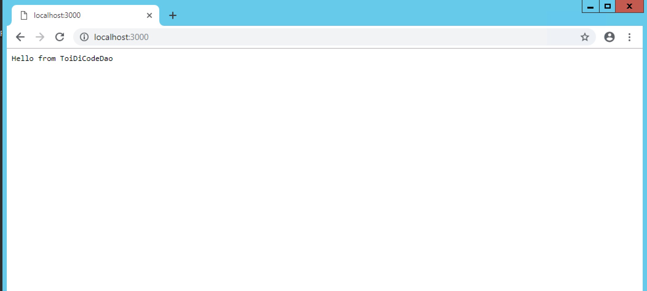 4. Để truy cập trang web mình vừa tạo, các bạn mở chrome lên, gõ localhost:3000 vào trình duyệt nha. Có thấy Hello từ Tôi Đi Code Dạo chưa?