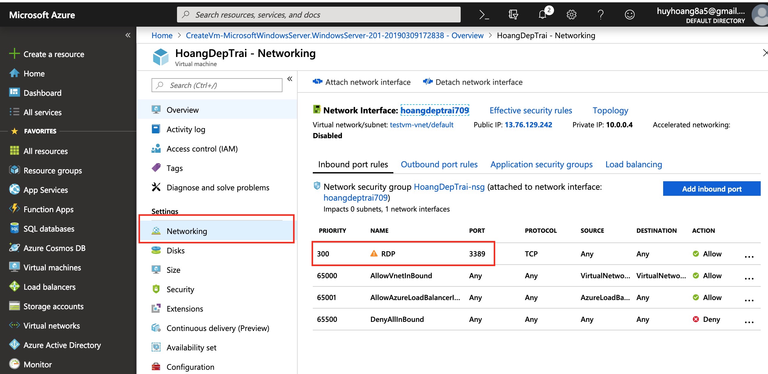 3. Các bạn quay lại Azure Portal (portal.azure.com), vào lại VM của mình, bấm vào phần Networking. Tại đây các bạn sẽ thấy port 3389 đã mở.