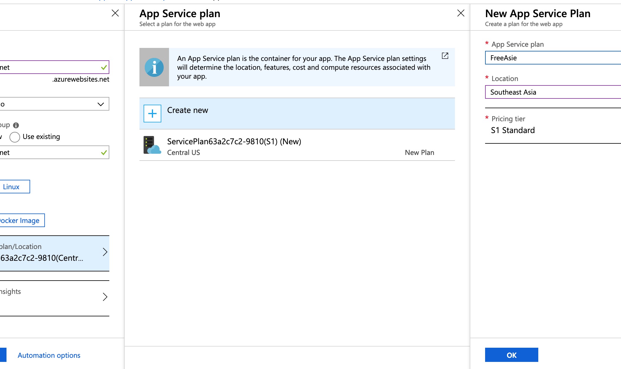 3. Bấm vào App Service Plan => Create New => Chọn khu vực là South East Asia. Các bạn có thể xem lại bài trước để biết App Service Plan là gì. Nói nôm na nó là con máy ảo sẽ chạy app của chúng ta đấy!