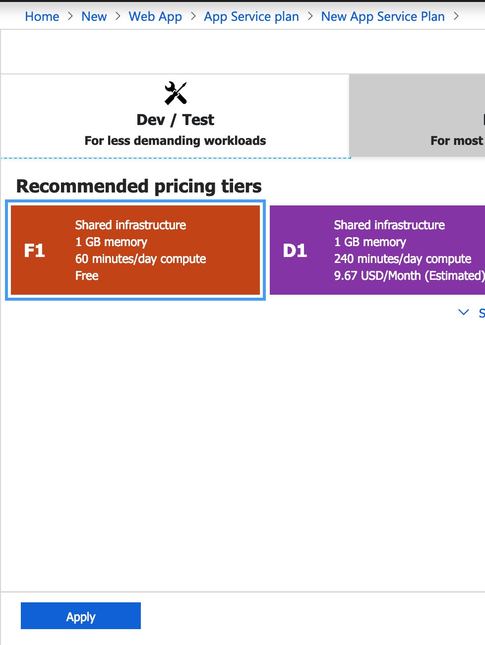 4. Trong mục App Service Plan, bấm Pricing Tier => Dev/Test => Chọn F1 để dùng gói free => Bấm Apply