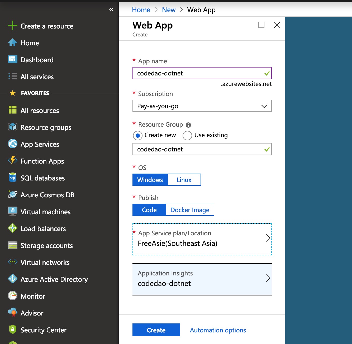 5. Quay lại đoạn tạo app, bấm Create để tạo Web App.