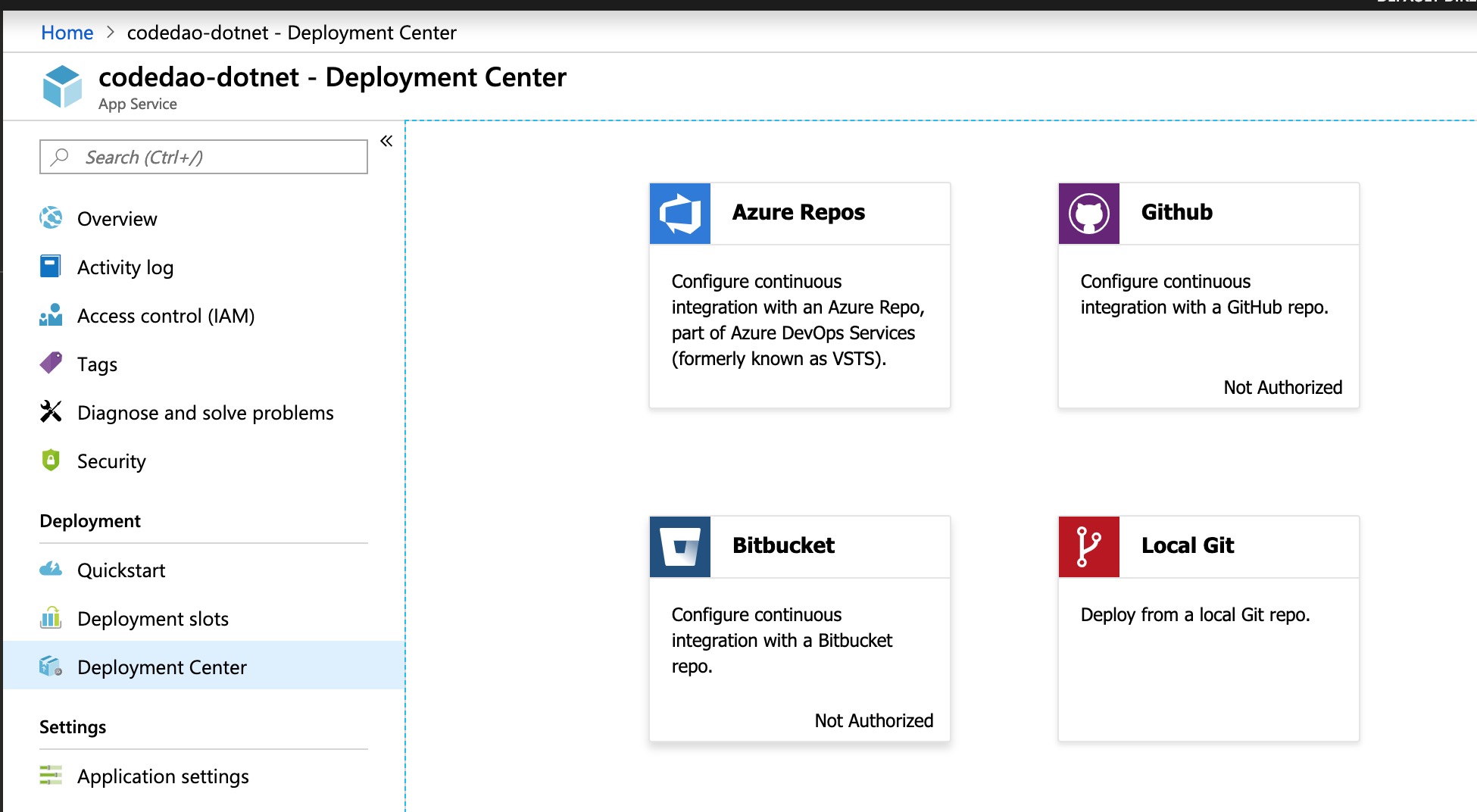 1. Các bạn quay lại Web App của mình -> Deployment Center -> Local Git. Bấm Continue.