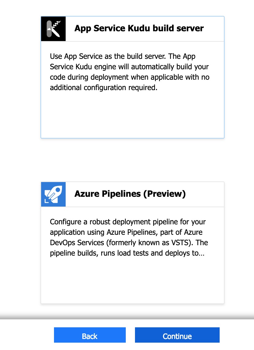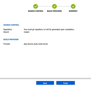 2. Chọn App Service Kudu build server, bấm Continue => Finish. Chờ 1 xíu để Azure tạo git branch cho bạn push code lên.