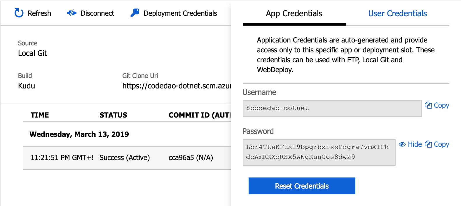 6. Gõ git push azure-deploy để push code lên branch đó. Khi nó đòi username và password thì các bạn quay lại Azure Portal, bấm vào Deployment Credential để lấy nhé.