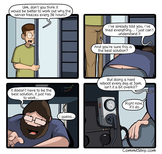 Trên lý thuyết, khi tìm được nguyên nhân làm hệ thống sụp, ta sẽ tìm được cách giải quyết đúng hơn, hợp lý hơn. Trên thực tế, đôi khi việc này sẽ tốn nhiều thời gian hơn, ảnh hưởng tới hình ảnh/doanh thu công ty.