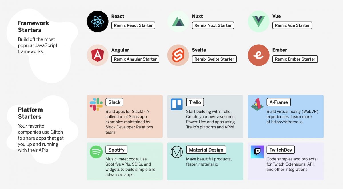 Glitch có sẵn khá nhiều Template từ React/Angular cho tới Slack App … Bạn chỉ cần bấm Remix và bắt đầu sửa code để bắt đầu code ngay cho nóng, không cần setup nhiều.