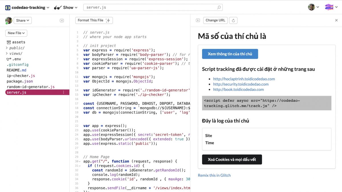 Ví dụ, khi mình code 1 trang sử dụng Cookie để theo dõi người dùng, mình có thể share project Glitch tại glitch.com/~codedao-tracking.